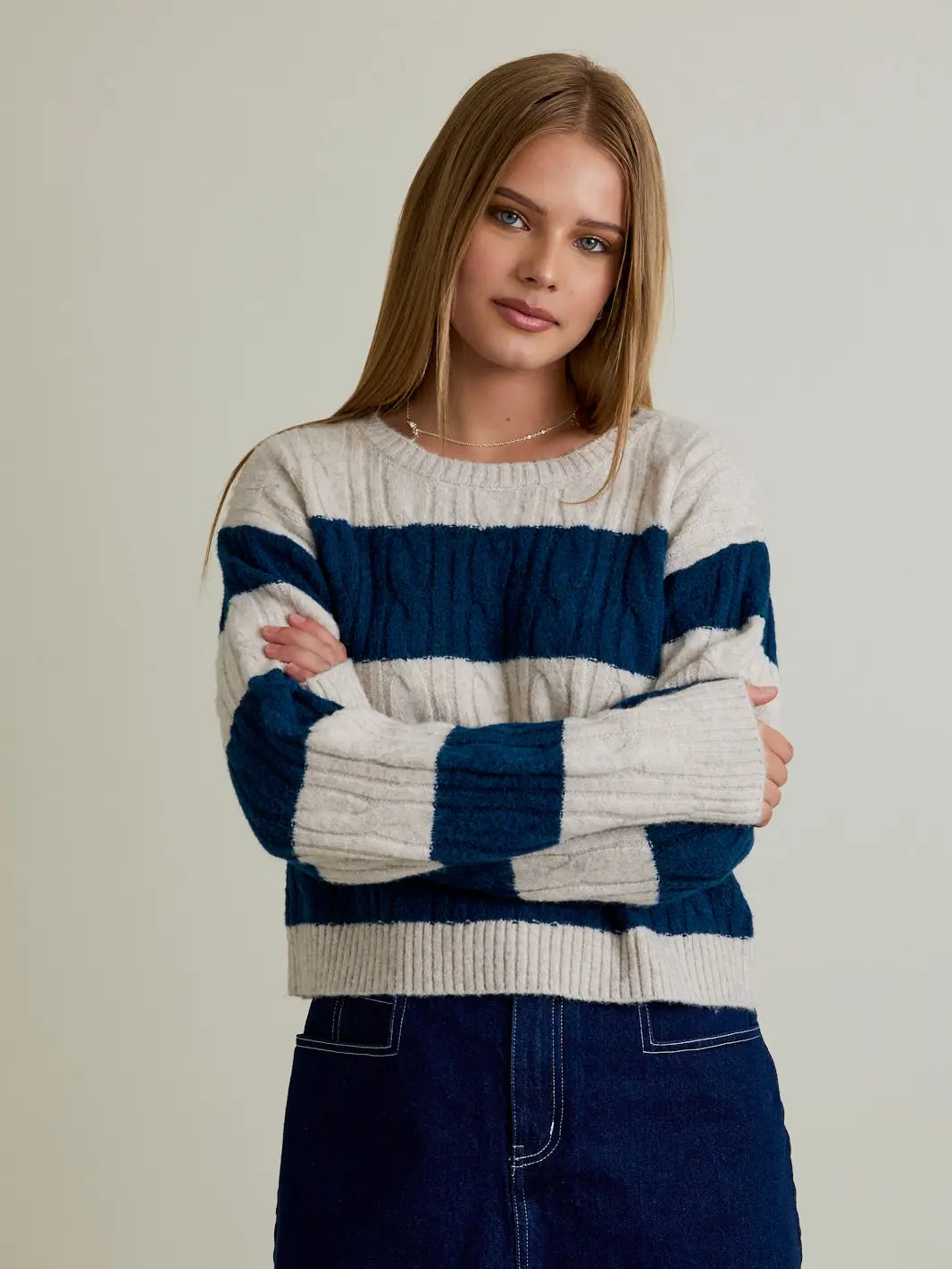 Elevate your everyday wardrobe with the Allie Cable Knit Sweater, a timeless piece that effortlessly transitions from season to season. Featuring a sophisticated taupe and navy stripe pattern, this classic cable knit design offers both visual interest and enduring style. Perfect for layering or wearing solo, the Allie delivers the cozy comfort and polished look you've been searching for.