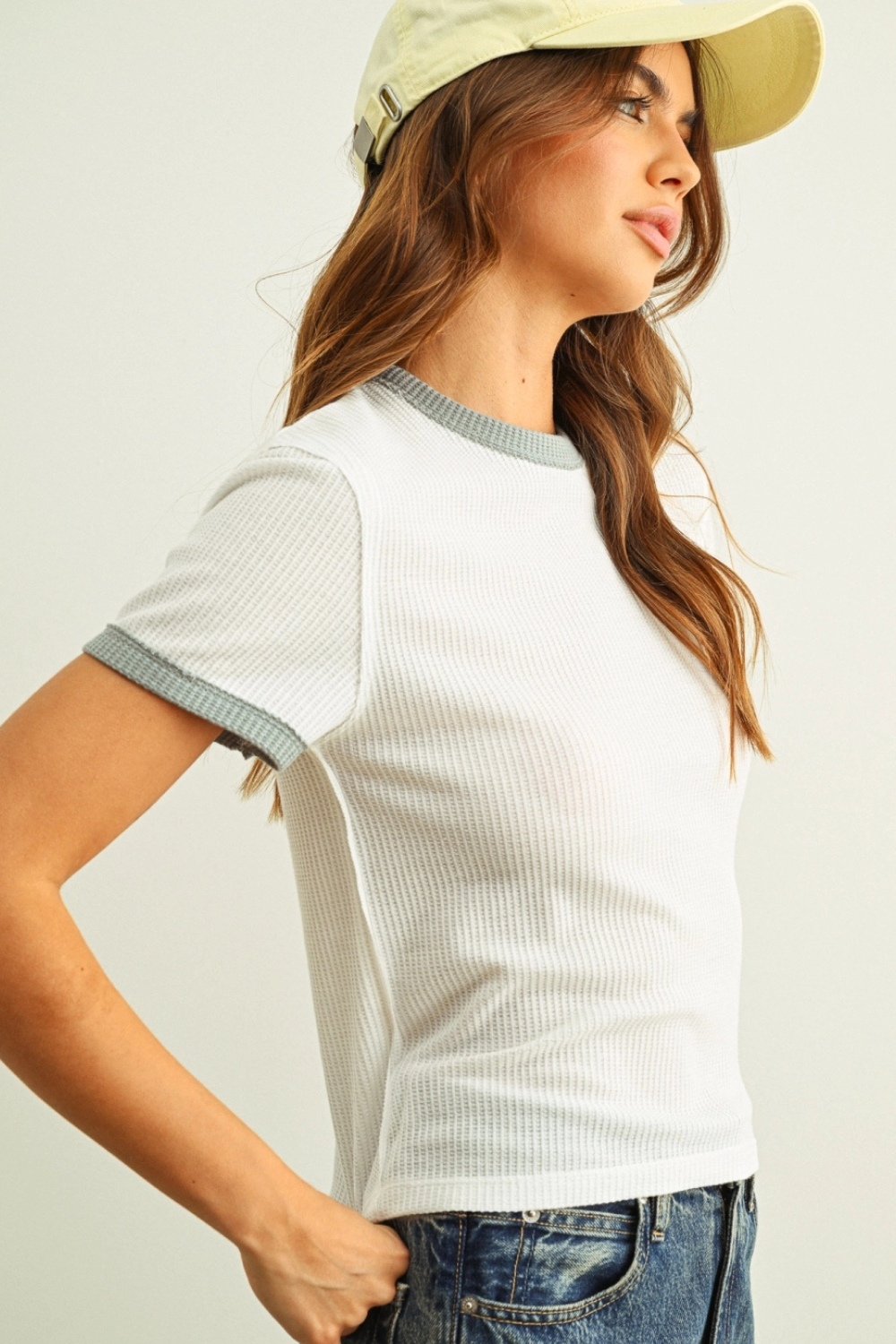Elevate your everyday style with the Dylan Waffle Top, featuring a textured waffle knit and striking blue trim that adds instant visual interest. The fitted silhouette flatters your frame while the playful back stitching detail keeps things fresh and unexpected. Versatile enough to pair with jeans for a casual vibe or shorts for warmer days, this piece works as hard as you do. A wardrobe essential that bridges comfort and contemporary style.