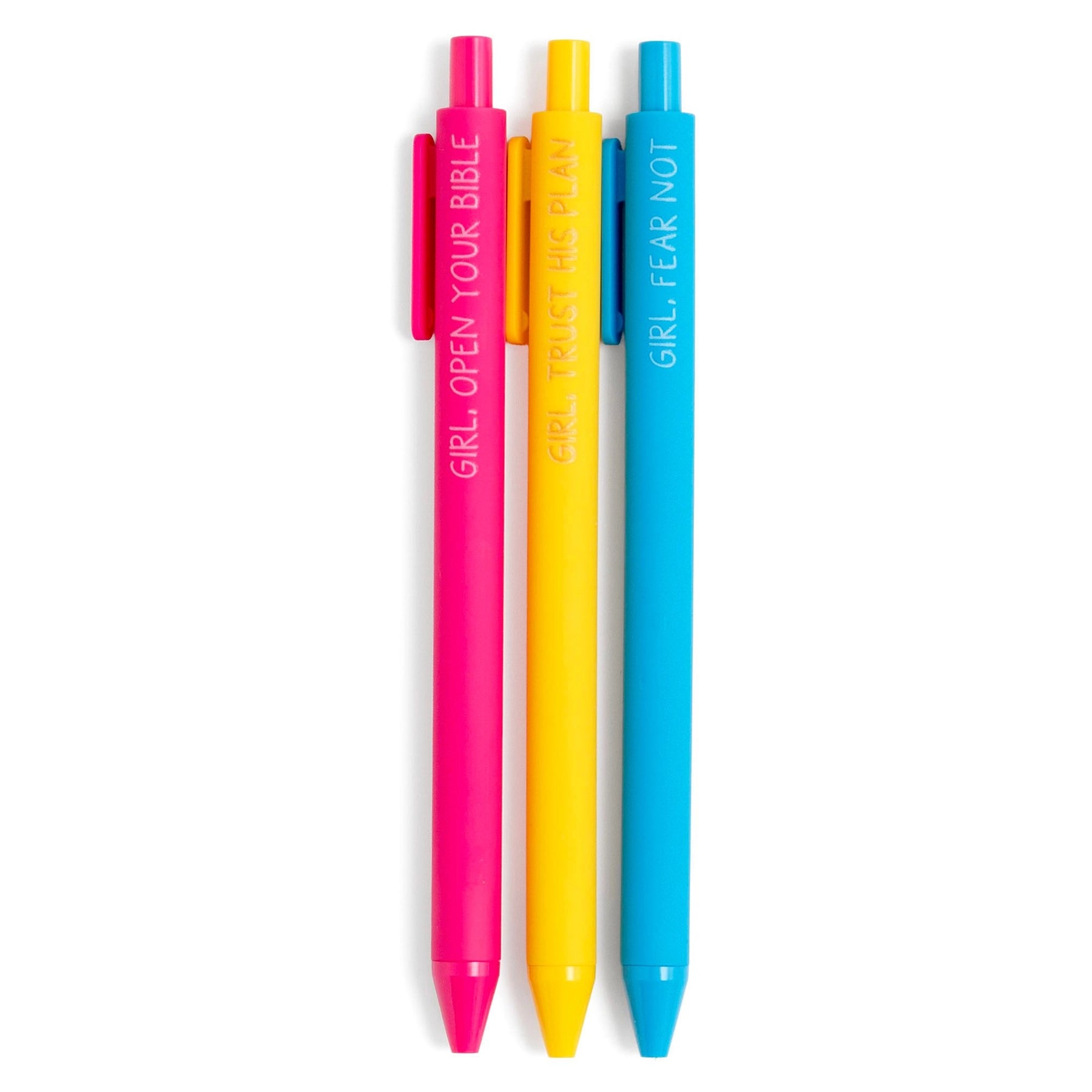 Encourage your faith with the Blessed Girl Pen Set, a vibrant trio of click-style gel pens featuring powerful reminders to walk boldly in God’s truth. Each pen is printed with faith-filled affirmations like “Girl, Fear Not,” “Girl, Trust His Plan,” and “Girl, Open Your Bible” — perfect for journaling, note-taking, or daily devotionals. A must-have for faith-based encouragement, back-to-school, or Sunday school surprises.