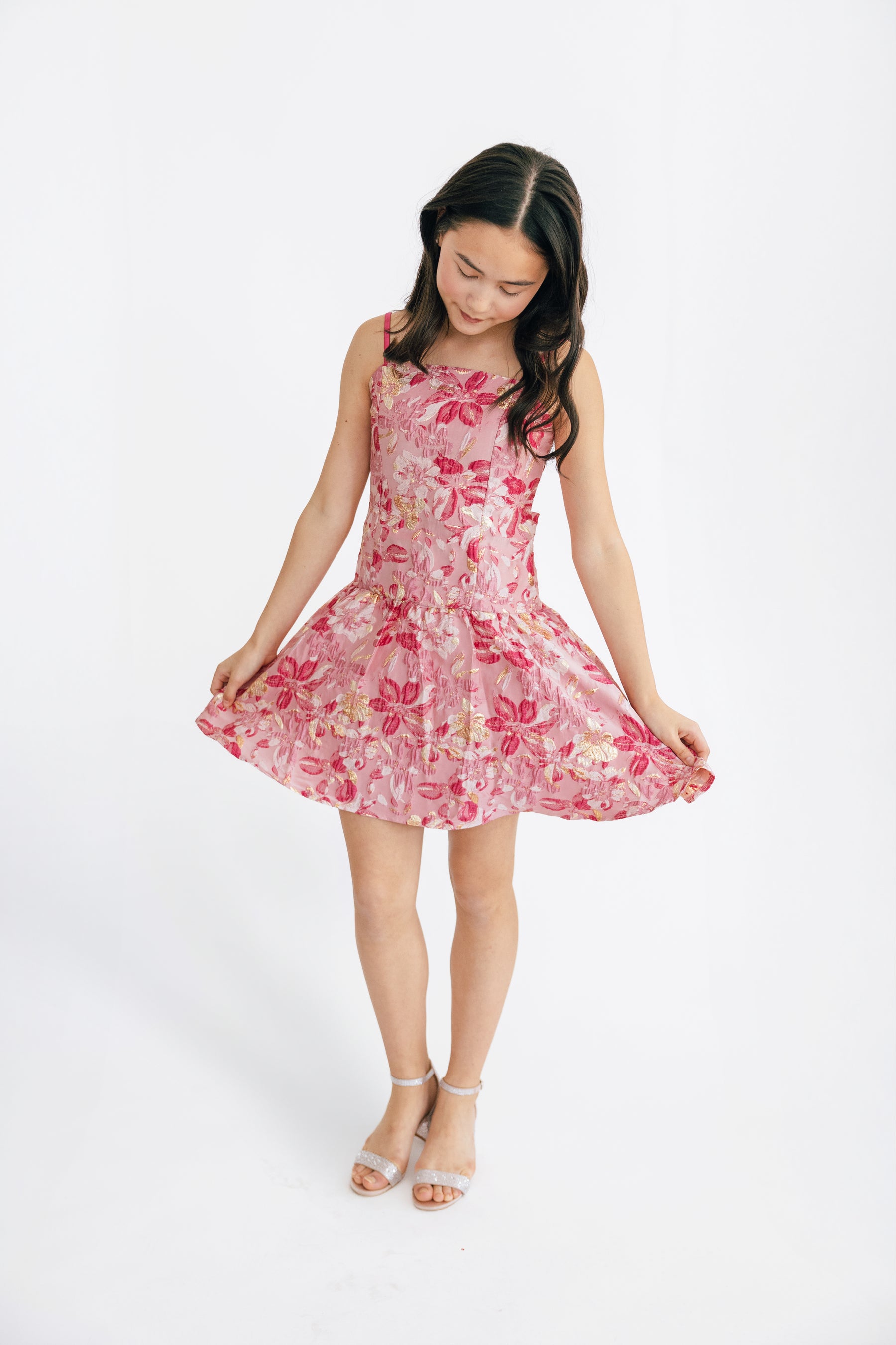 The LEXI Lace Up Back Low Waisted Sheared Dress features a delicate pink and gold flower jacquard print, combining elegance with a trendy silhouette. Its open back design adds a touch of sophistication, while the low-waisted cut flatters the figure. Perfect for tweens and teens, this dress is ideal for parties and special occasions, offering a fashionable choice that stands out with subtle luxury and youthful charm.