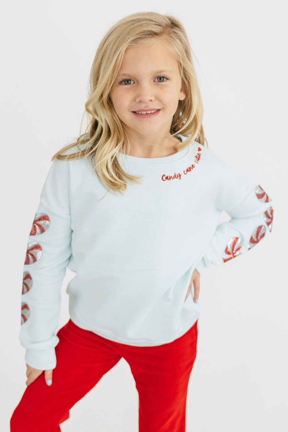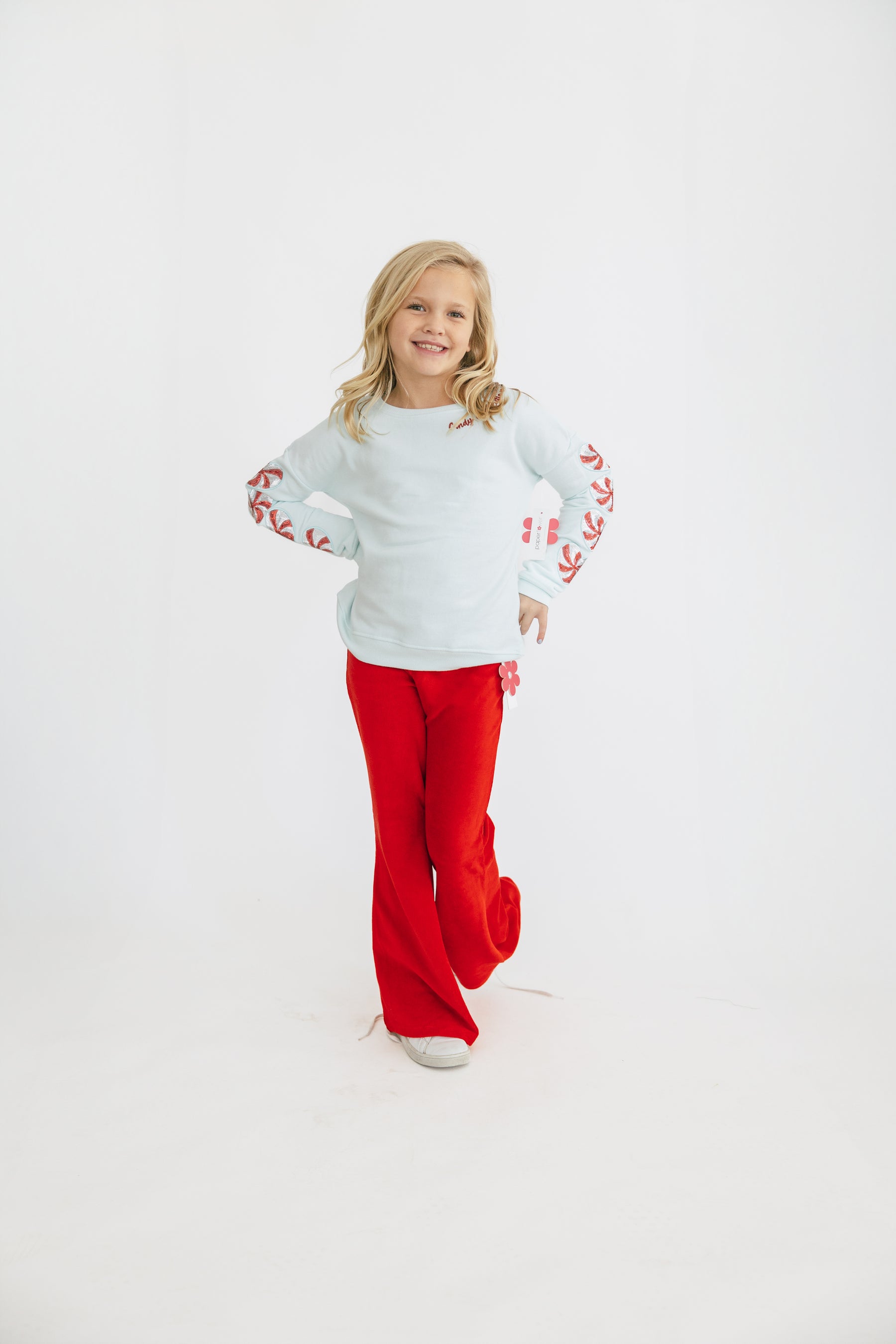 Celebrate the season in style with the Candy Cane Cutie Sweatshirt by Paper Flower. Featuring festive sequin detail on the sleeves, this versatile sweatshirt effortlessly transitions from cozy casual to holiday party-ready. Perfect for dressing up or down, it adds a touch of sparkle to your Christmas wardrobe while keeping you comfortable and chic.