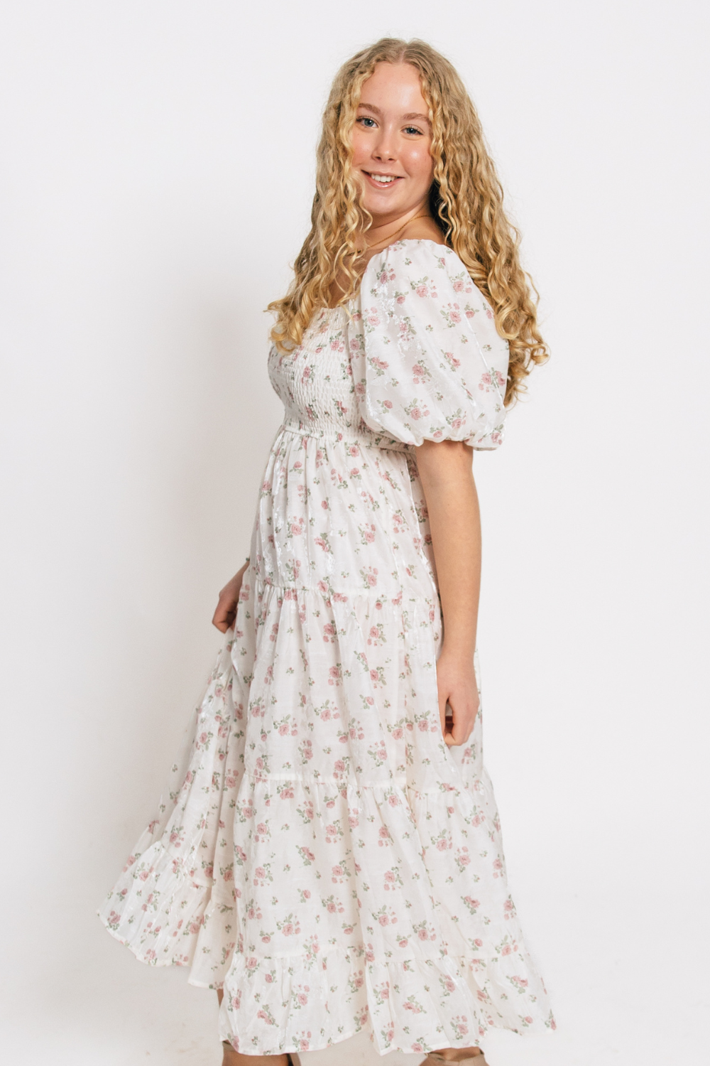 Step into timeless elegance with the Morgan Floral Maxi Dress. The square neckline and smocked bodice sculpt a flattering silhouette, while puff sleeves introduce a whimsical, feminine flair. Tiered layers flow gracefully with movement, and the elasticized back waistband guarantees comfort from morning through evening.