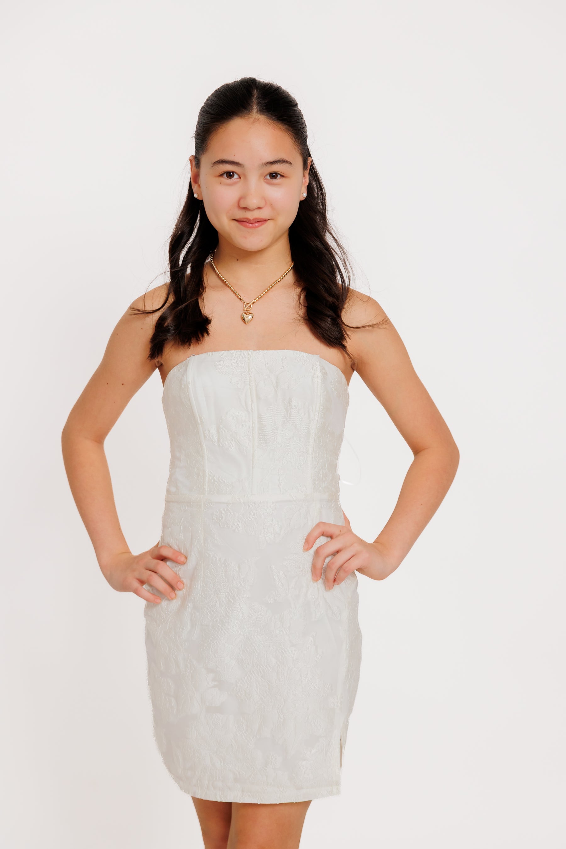 Elevate your wardrobe with this stunning White Floral Jacquard Mini Dress, designed to turn heads at any occasion. The structured white boned bodice provides a flattering silhouette and all-day support, while the delicate floral jacquard fabric adds sophisticated texture and visual interest. Perfect for date nights, parties, or special events, this dress combines timeless elegance with modern style. The boned construction ensures a polished, put-together look that flatters your figure beautifully. Make a statement with a dress that's as confident as you are.