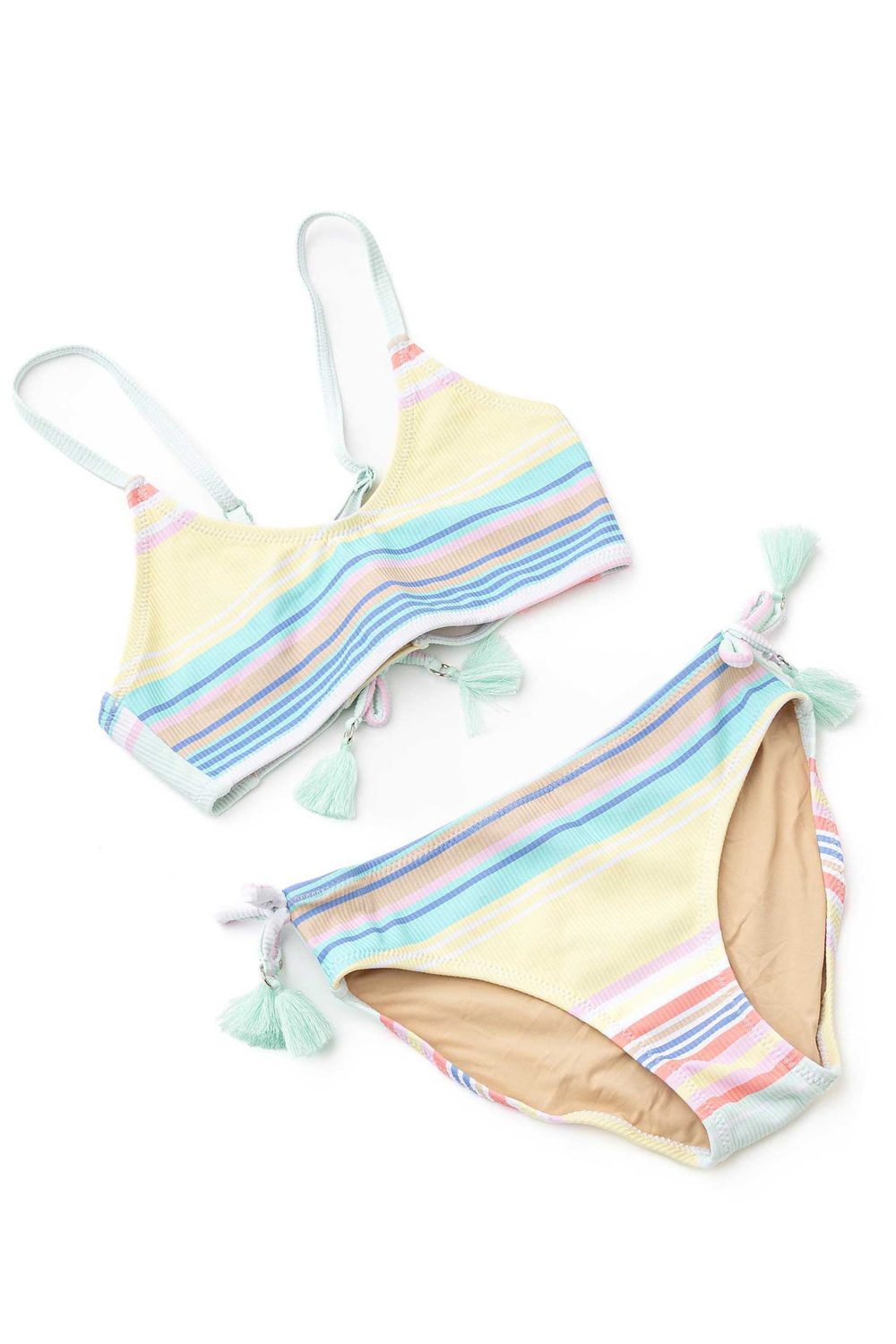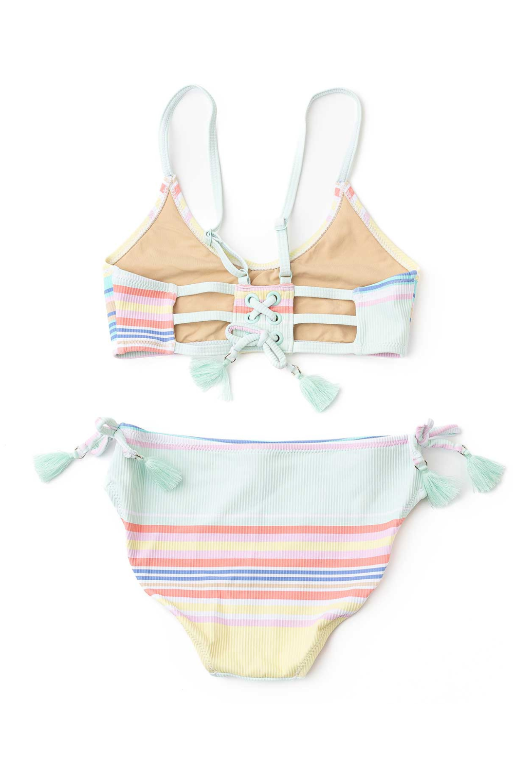 Your tween will love the stylish and playful Surfer Stripe Tie Back Two Piece Swimsuit, designed for comfort, confidence, and sun protection. Featuring cute tassel detailing on the top and adjustable straps for a customizable fit, this swimsuit is perfect for all her beach and poolside adventures. The tie-back closure ensures a secure fit while offering a trendy touch, while the full cut coverage provides comfort and confidence in the water.
