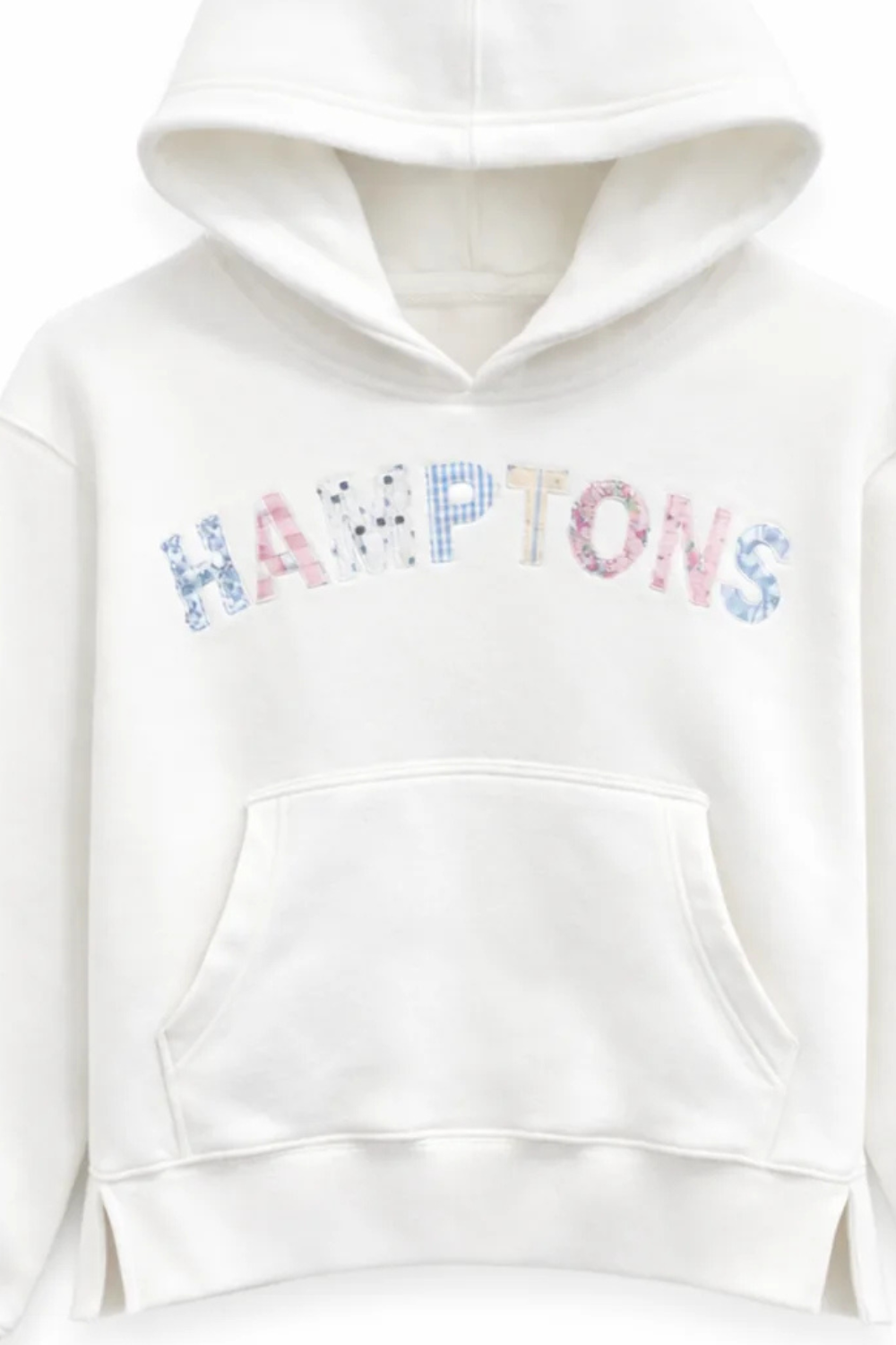 • Soft white hoodie with pastel patchwork “Hamptons” lettering