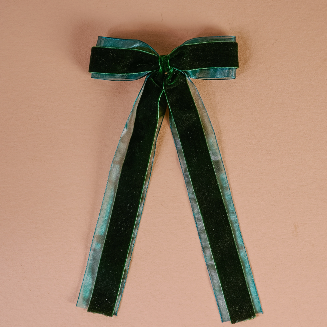 Elevate your everyday with the Velvet Luxe Layered Hair Bow—a modern take on timeless elegance. Designed with rich velvet ribbon and a delicate sheer underlay, this layered bow brings a polished finish to any hairstyle. Its sleek silhouette and luxe textures make it perfect for special occasions or everyday glam, while the gold barrette clip ensures a secure, comfortable hold. Stylish and versatile for any occasion Soft, high-quality fabric with a chic, polished look Secure, comfortable all-day hold Gold barrette clip closure